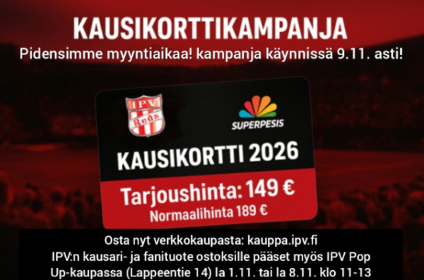 IPV:n suosittu kausikorttikampanja saa jatkoa – kampanja-aikaa on pidennetty isänpäivään 9.11.2025 saakka! Nyt on siis vielä hyvin aikaa varmistaa oma paikkasi tulevan kauden peleihin ja liittyä mukaan osaksi Reds-perhettä.